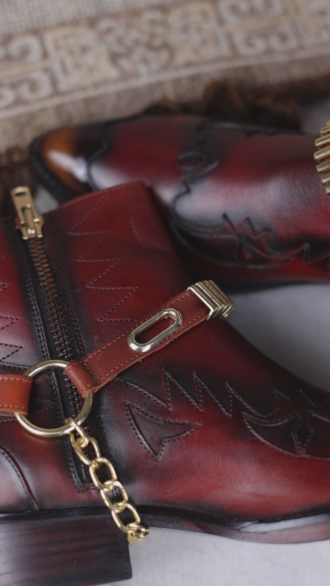 Choose between two unique finishes on the toe: a sleek patent patina for a polished look or a rugged wooden patina for a more earthy vibe. These boots effortlessly blend traditional charm with contemporary design elements, making them a versatile addition to any wardrobe.