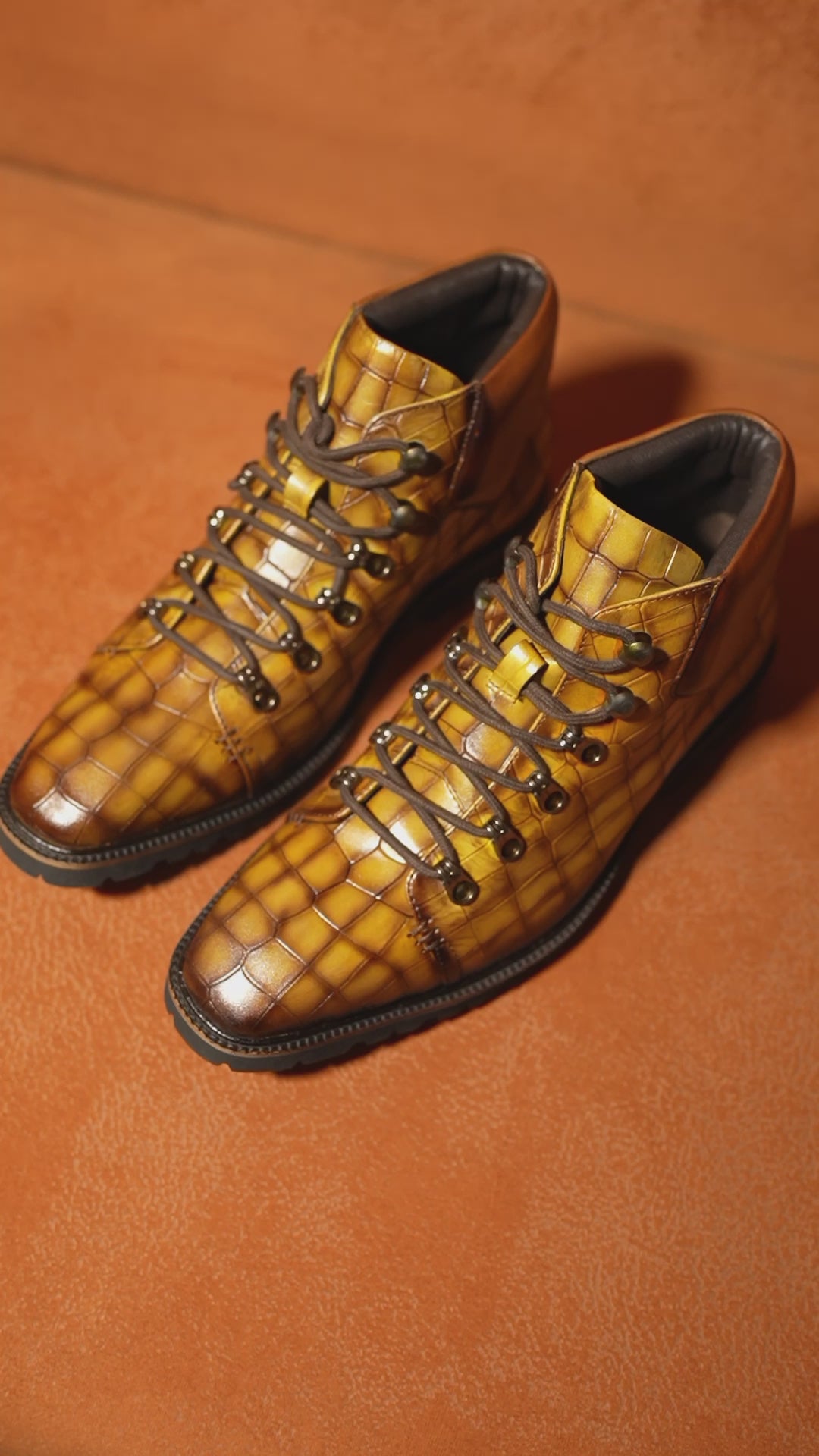 Savoy Chukka Boots in Curry Croco Leather are designed for the adventurous at heart. Crafted with a premium crocodile-embossed leather upper, these boots combine rugged style with exceptional comfort.